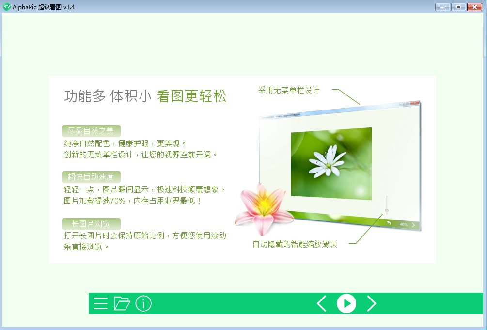 AlphaPic超级看图以其独创的全景式浏览模式而独树一帜,支持高分辨率屏幕的图片显示。借助“人工智能”技术,它能为长图、全景照片及小图等自动选择最佳显示模式。不仅兼容常见的图片格式,还支持RAW、JPEG-2000、Truevision Targa、IFF、SUN Raster等多种格式,有了AlphaPic超级看图,您的电脑看图需求便可轻松满足!