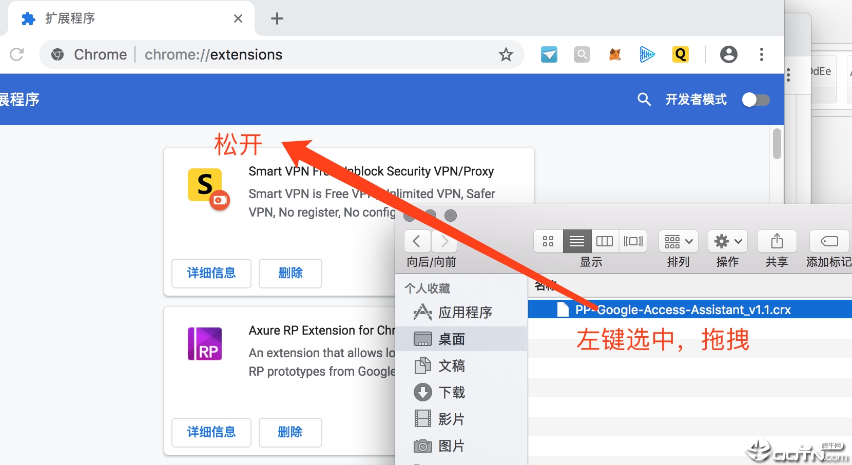 将之前下载并解压的crx文件拖动至“扩展程序”页面中,并松开。