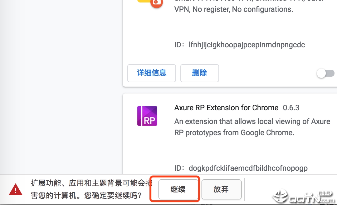 在看到提示后点击“继续”(浏览器对这种安装方式均会发出此提示,请勿感到困扰)。