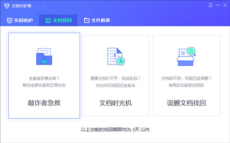 腾讯电脑管家文档守护者,乃是在WannaCry病毒肆虐之际,为保护用户财产及电脑内重要文档而应运而生的安全工具,由腾讯电脑管家倾心打造,具备实时防护、文档恢复及文件解密三大核心功能。