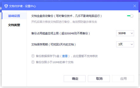 文档守护者采用了先进的备份技术,极大提升了性能与效率,目前已支持主流办公文档类型,用户亦可在设置中心手动添加需保护的文件类型。
