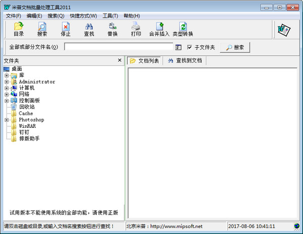 米普文档批量处理工具,旨在为用户提供便捷的Word文档批量处理辅助,支持查找、替换、打印、合并、拷贝、格式转换、页眉页脚设置、加密、标记等多种操作。