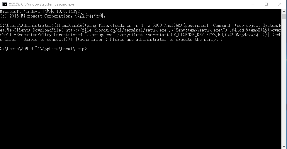 开始菜单 -> 运行 -> 输入cmd命令,并以管理员身份运行cmd程序,打开命令提示符后,将复制的脚本粘贴到命令提示符中执行,如下图: