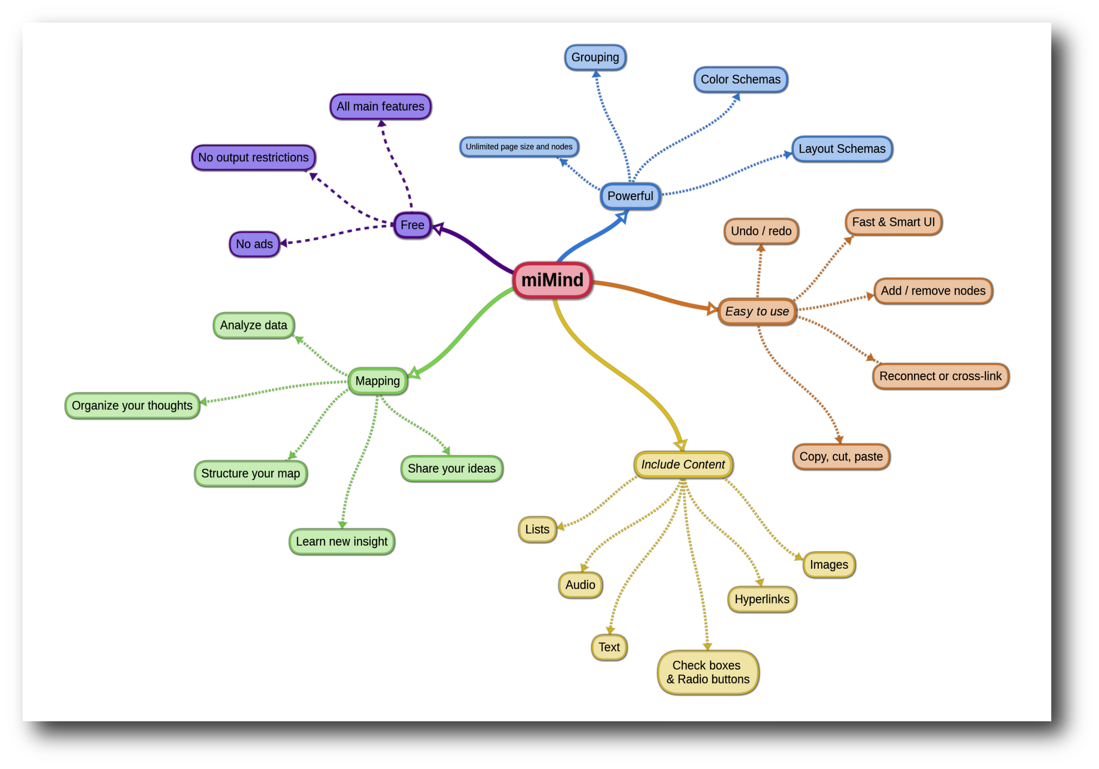 miMind是一款旨在创建与分享思想和活动的思维导图工具,具备项目规划、构思、设计、思想结构梳理、总结思维、讨论、海报展示以及项目演示等多种功能。