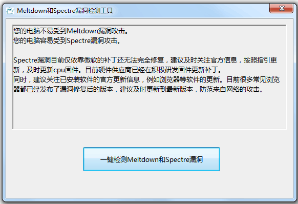 3. 点击下方的“一键检测Meltdown和Spectre漏洞”按钮,耐心等待扫描完成。此工具将检测您的电脑是否受到这两个漏洞的影响。