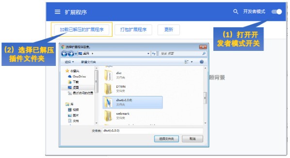 (3)在Google Chrome浏览器的扩展程序界面,选择开启开发者模式,选择【加载已解压的扩展程序】,在弹出的窗口中选择已解压的文件夹,注意此处选择根目录。