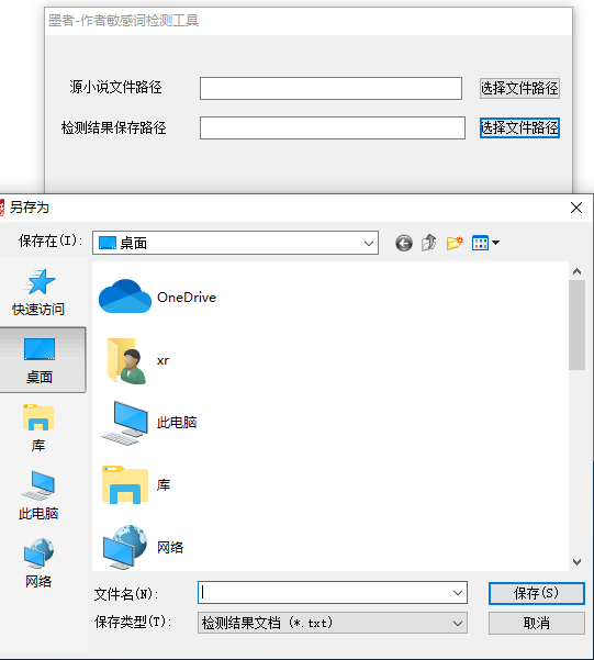 3、点击下方的“选择目标文件路径”按钮,设定敏感词检测结果的文件名(例如“敏感词”,并点击“保存”)及保存路径;