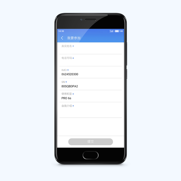 4. 「Flyme社区」客户端会自动填入手机的设备信息,因此只需完善个人资料,即可提交报名申请。