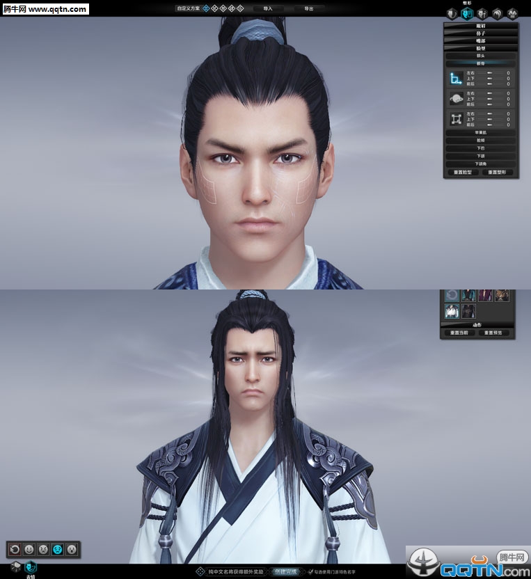点击“定制细节”可进一步调整角色的细节,在此界面中您可以看到更多角色的细节,并针对每一项进行精细调节。根据人类面部骨骼与肌肉的自然分布,现有48根骨骼上总计超过200项可调参数,并同时提供4种面部表情的预览及5套外装的试穿功能。
