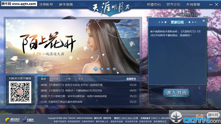 在游戏登陆器中,您将看到官网的最新新闻公告及活动信息。顶部导航提供了便捷通往官方网站、注册账号、新南、充值中心、官方论坛及在线客服的入口。左下角的二维码可供您扫描关注官方微信,随时获取游戏相关资讯。
