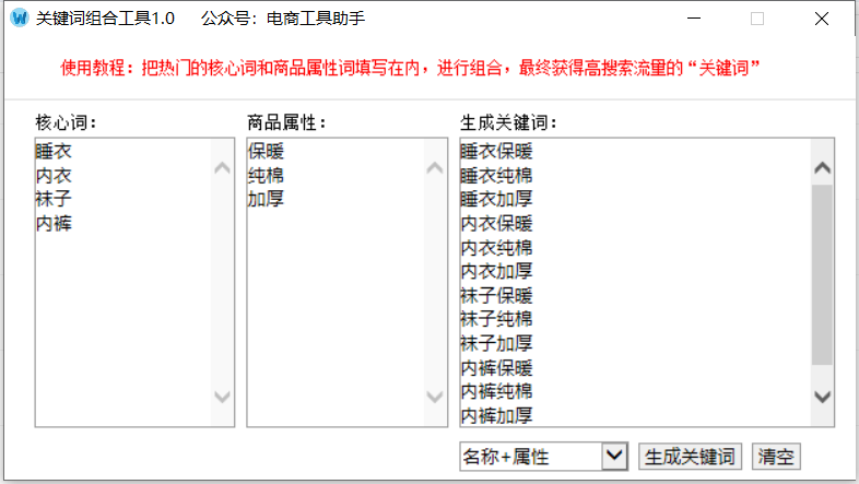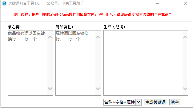 关键词组合工具是一款卓越的标题生成软件,能够依据输入的两组关键词,构建出所有可能的组合标题。此工具通常用于电商商品的标题生成,若您有此需求,切勿错过,诚邀您下载体验!