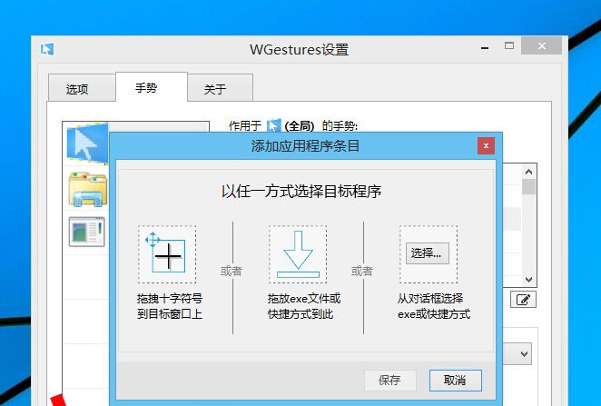 除了软件预设的一些全局手势外,您还可以添加自定义手势,这些手势既可以是全局的,也可以专门针对某款软件。例如,您可以为Google Chrome增添强大的鼠标手势功能,无需再安装那些不甚理想的鼠标手势插件。如下图所示,点击加号,然后按照提示添加指定程序: