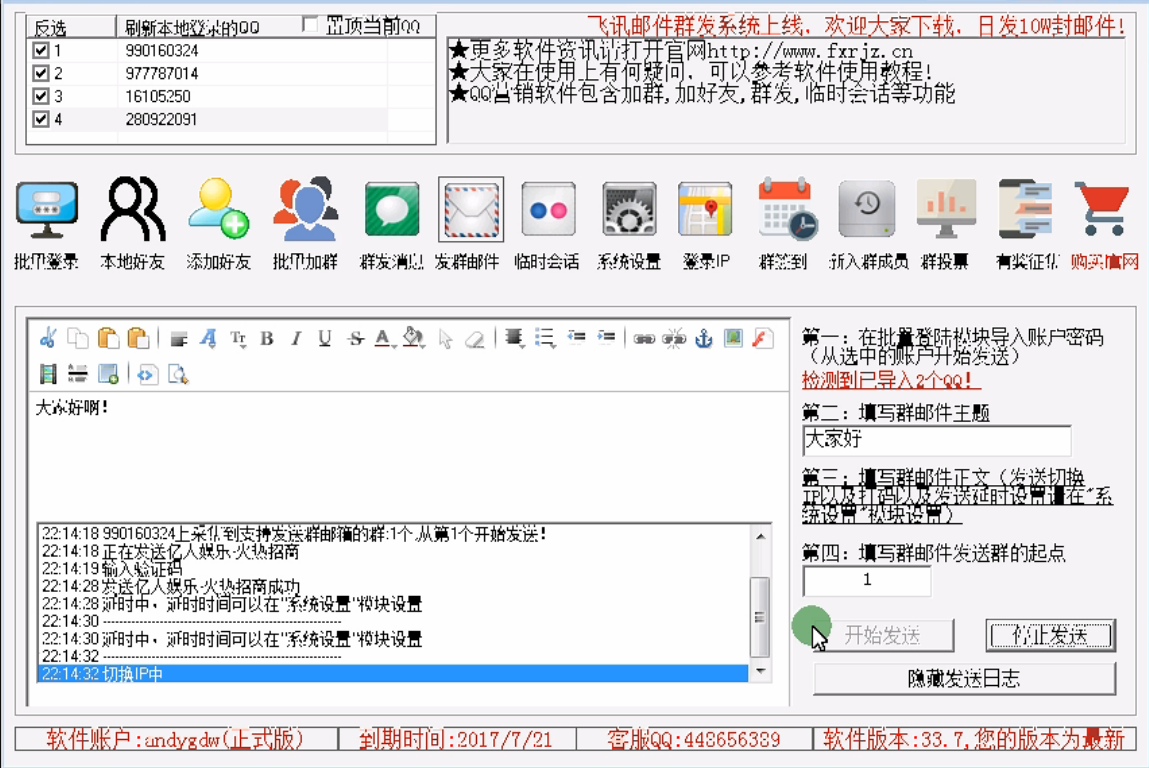 2. 支持批量导入QQ账号,并自动切换账号进行发送。