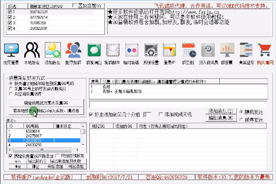 飞讯QQ批量加好友软件是一款功能强大、专业而实用的QQ加好友工具,具备自动添加QQ好友、批量账号添加特定好友以及采集QQ号码等多项功能。其操作简便,是推广活动的必备良品,有需要的朋友可尽快下载使用。