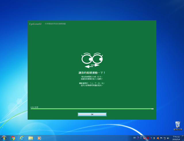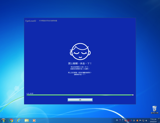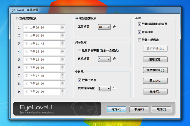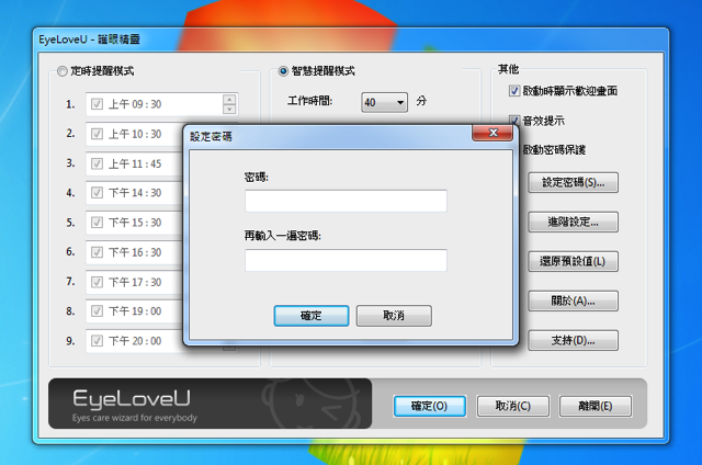 此外,为了防止孩子过度沉迷于电脑,家长可启用「儿童家长专用」选项,该功能可在设定的时间限制到达时强制锁定屏幕,并且能够设定密码以防止EyeLoveU被关闭。
