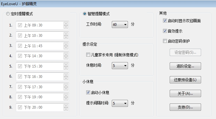 STEP 2 启动EyeLoveU护眼精灵后,默认为「智慧提醒模式」,该模式会在工作时间达到一定时长后自动提醒休息。在此模式下,还可启动「小休息」,定时提醒您眨眼或转动眼睛。