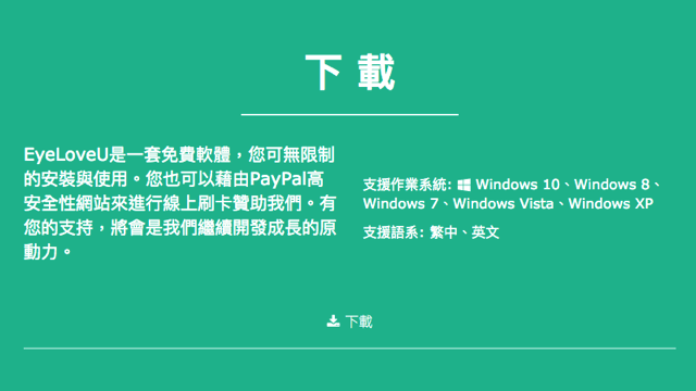 STEP 1 访问EyeLoveU官方网站,点击「下载」,即可找到软件的下载链接,支持Windows XP及之后的各个常见Windows版本,包括最新的Windows 10。