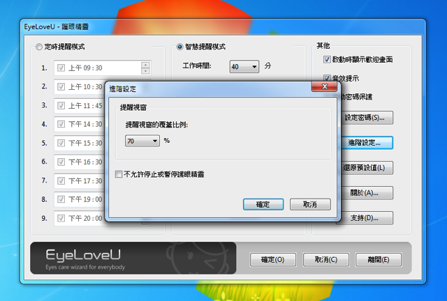 在「进阶设定」中,您可以调整提醒窗口的覆盖面积,默认为70%,此设计旨在确保在提醒模式下仍可进行必要的工作,比如保存文件或暂时关闭某个程序;因提醒功能十分灵活,您可点击下方按钮将其关闭。如希望更为严格地要求自己休息,可以勾选「不允许停止或暂停护眼精灵」,以达到强制休息的效果。
