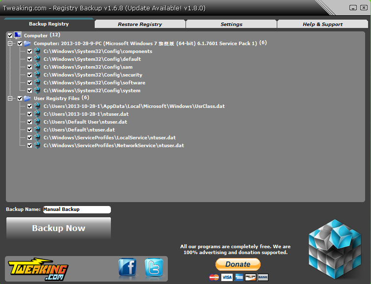 Tweaking Registry Backup是一款便捷的工具,专为用户的系统注册表提供备份与删除功能。该工具能够自动扫描系统注册表,并一键备份扫描到的内容。当用户在清理注册表时,若不慎误删了关键的注册表项,此工具亦能通过备份帮助用户轻松恢复,非常实用与方便。