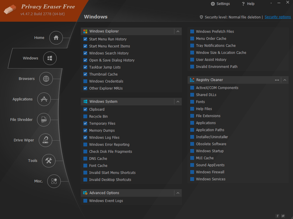 该软件同样可以清除近期文件、临时文件、回收站内容、剪贴板、任务栏跳转列表、DNS缓存、日志文件、内存转储及错误报告等。同时,Privacy Eraser支持插件扩展清理功能。通过自制插件,您可以轻松删除任何应用程序留下的痕迹。Privacy Eraser内置200多个免费的插件,支持最流行的程序,包括ACDSee、Adobe Reader、Microsoft Office、WinZip、WinRAR、Windows Media Player、VLC Player、eMule、BitTorrent、Google Toolbar等。该软件兼容Microsoft Windows的FAT16、FAT32、exFAT及NTFS文件系统,全面遵循并超越美国国防部和国家安全局的清理与消毒标准。因此,您可以安心使用,一旦擦除,您的文件数据将永远消失,无法恢复。