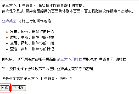 成功登录豆瓣账户后,将进入豆瓣授权界面,点击“同意”即可完成授权。