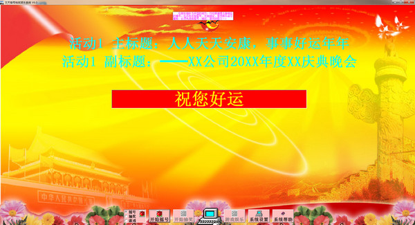 6、此系统兼具大厅与厨房的多重适用性,既适合严肃正式的场合(如房地产销售中的选房摇号活动),也适合各种趣味游戏娱乐活动。特别是在应用此系统后,用户无需再为各类会议专门制作PPT背景文件。通过系统的消隐与拖放功能,可以轻松隐藏“摇号、抽奖与游戏”相关信息,突出“会议主题”及“会微(Logo)”,并将其拖放到合适的位置,调整字体、大小与颜色,再根据节日与行业特色选择相应的背景图片与背景音乐。经过如此精心设置,便可轻松构建出一个适合各种会议的氛围。