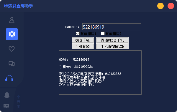 维森君查绑助手(Q绑查询)是一款非常好用的QQ辅助工具,它的页面简洁,功能强大,能够帮助用户轻松一键通过QQ号查询到对应绑定的手机号,反之亦可,感兴趣的朋友不要错过了,欢迎大家下载体验。