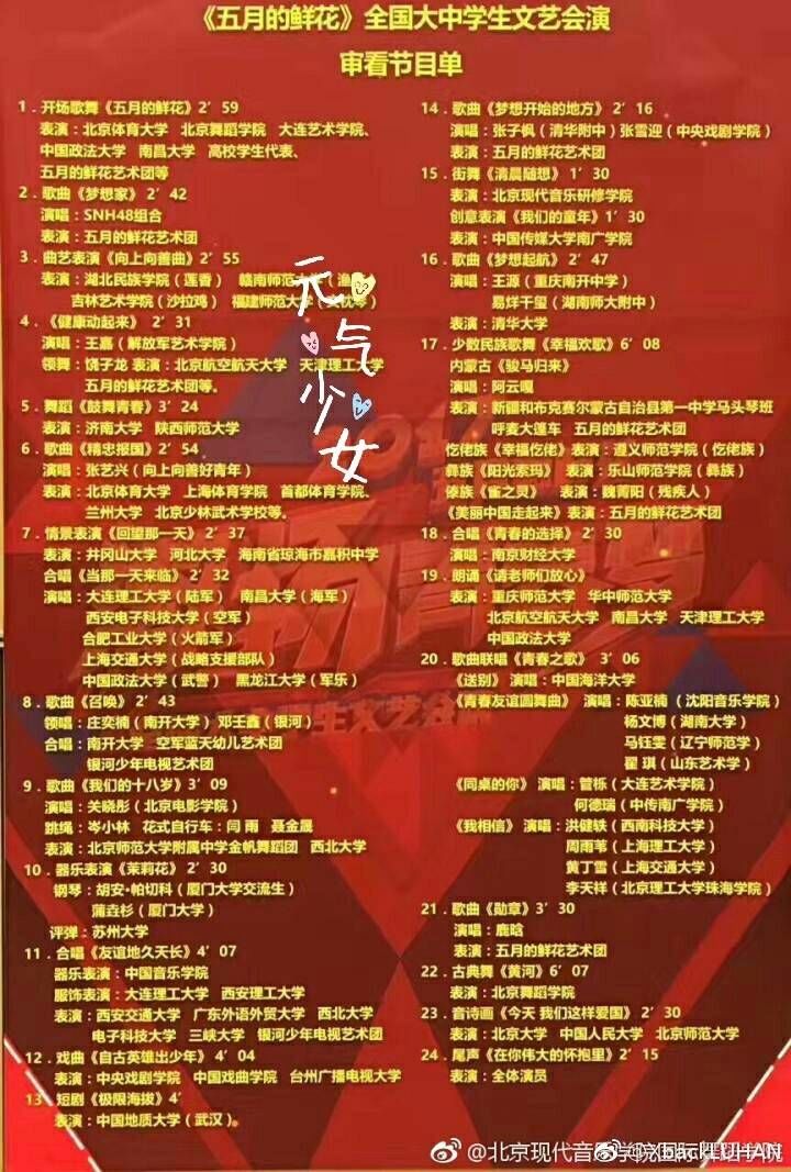 本届会演除了歌曲、舞蹈、器乐、诗朗诵、武术、创意表演、绝技绝活等常态节目类型,还将首次推出相声、魔术、杂技和戏曲等节目类型,以此展现当代学子丰富多彩的文化生活。同时,青年优秀歌手组合TFboys成员王俊凯、优秀青年歌手王紫凝、、优秀青年演员刘雨欣、奥运冠军何姿、著名歌唱家雷佳等也将亮相本次晚会。除了千玺与王源,今年五四青年晚会鹿晗、杨洋、关晓彤、张艺兴、张子枫众明星将会参与晚会节目,而具体内容敬请等待官宣声明。