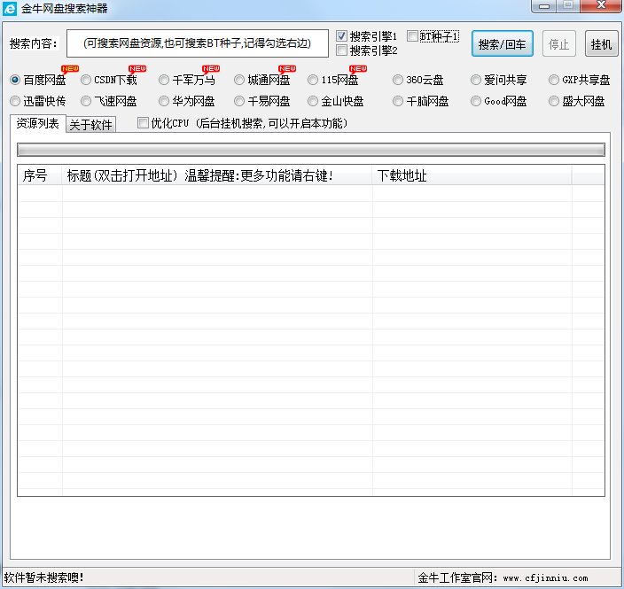 金牛搜索神器是一款免费绿色的网盘,这款搜索器操作简单,你只需要输入想要搜索的关键词,它就能帮你一键搜索百度网盘、360云盘、微云等主流网盘相关资源及BT种子并解析提供下载链,网盘内每天为你更新大量资源,让用户不在为BT种子搜索而犯愁,有了它一切变得轻松又简单。