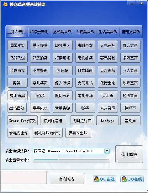 蝶恋草音频音效辅助,适用于网络主播喊麦使用,自带掌声、笑声等上百种主持辅助音效。可设置快捷键,一键启动,可设置声音通道实现不卡麦、无回音,可自定义选择自己喜欢的声音片段添加到软件页面使用方便快捷!