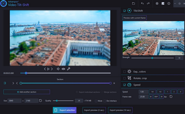 Ashampoo Video Tilt-Shift 可以为您的视频添加炫酷的微缩效果,这一效果最早出现时曾在专业摄影领域引起了轰动。只需点击几下巧妙地调整焦距和锐度,视频中的建筑、风景和物体即可看起来像微缩模型一样。为了获得更好的效果,可以像素级精准的调整效果的视角、宽度和强度,内置实时预览避免出现不理想的结果。同时软件并不仅限于此!除了和透视操作外,此移轴程序还可以通过简单的滑块调整曝光和颜色。当然,也能裁剪视频为自定义或常见的宽高比(16:9、4:3 等),并且旋转或翻转视频。用户甚至可以修改播放速度以模拟慢速或延时效果。