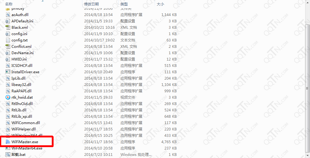 将下载的WiFi共享大师绿色版包解压,进入WiFiMaster文件夹,打开如下图所示WiFiMaster.exe,即可运行WiFi共享大师绿色版