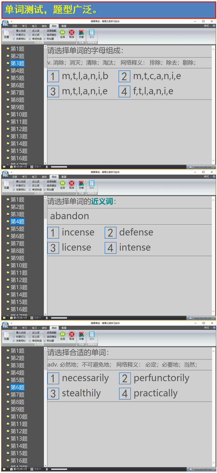 12.单词测试:有看义找词,听音识义,近义词,反义词等等多种类型试题。