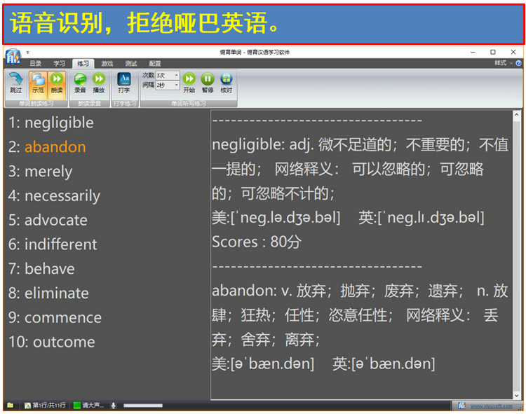 4. 朗读评分:软件的英语识别能够对用户单词朗读给出评分。