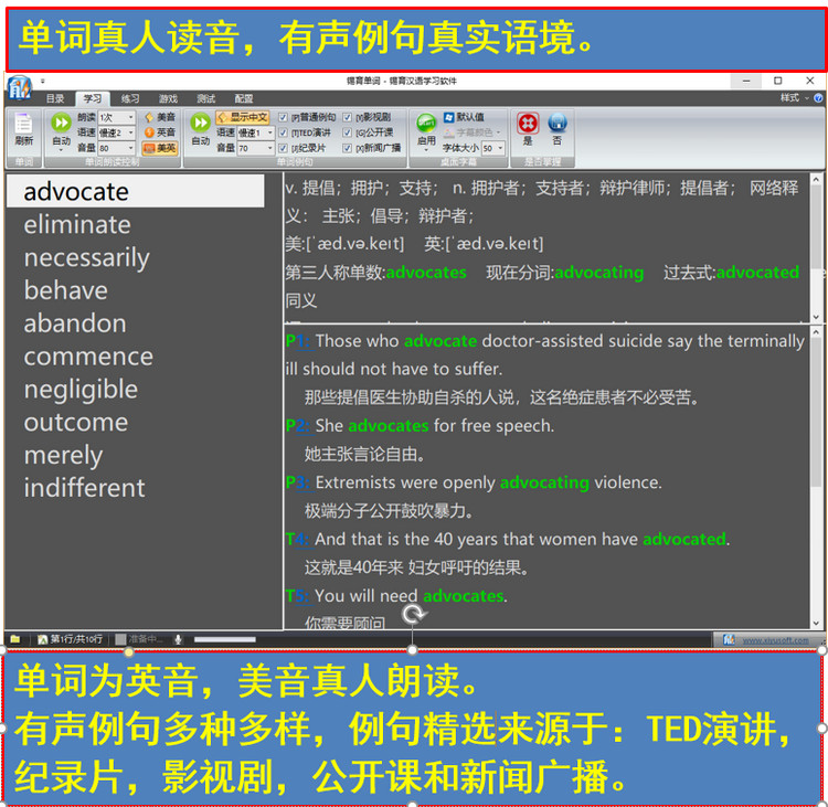 锡育英语软件是一个使用简单,功能强大的软件。不仅单词是真人朗读,单词例句来源于ted演讲,影视纪录片等等,更是真实语境。语音识别,朗读评分功能有利于用户提高发音准确性。