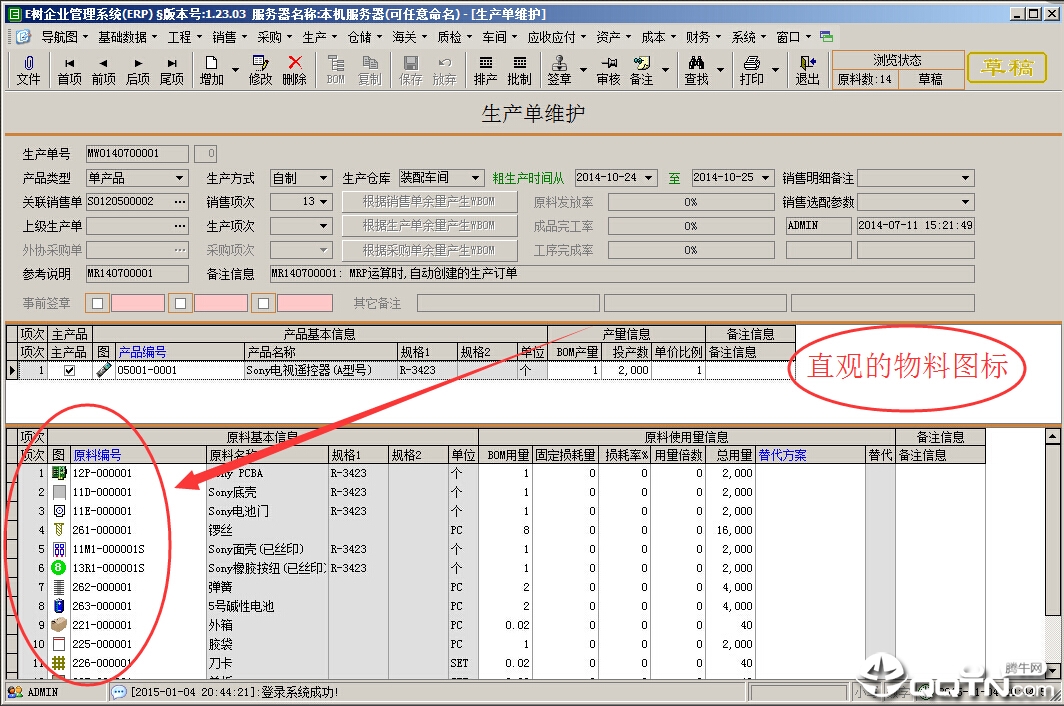 11、物料可按种类设定一个16X16的图标,在表格中,将会带出这个图标,以方便用户一眼看出这是什么物料.