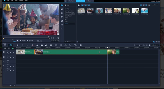 最后返回会声会影编辑器,在故事版中插入两幅图像素材。用户便可在导览面板中预览自动添加的转场效果;