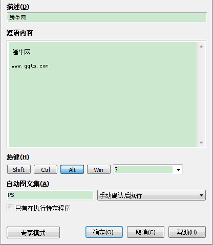 如按照下图设置后,通过快捷键 Alt+S 或 PS (自动图文集),就可以快速输入文字了。