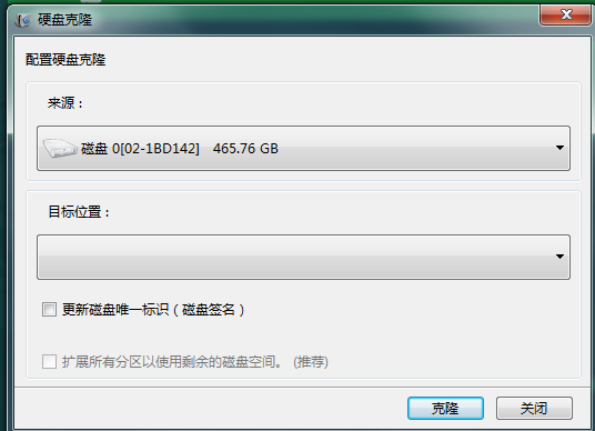 硬盘克隆:进入配置硬盘克隆页面,源硬盘不能是目标硬盘。