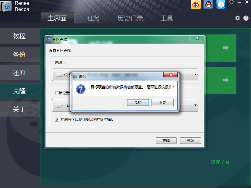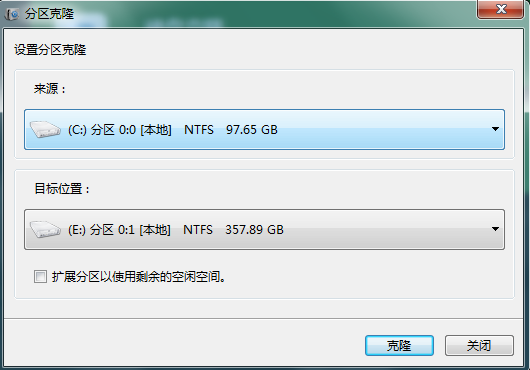点击分区克隆,进入设置分区克隆页面,选择需要克隆的分区来源,选定克隆的目标位置,这里请注意,目标克隆的分区要大过需要克隆的分区,才能完整克隆该分区的数据。目标位置被克隆后,原有的数据将会被覆盖掉,所以要谨慎保存好目标分区的原有数据,或者选择一个移动的硬盘来作为目标位置。