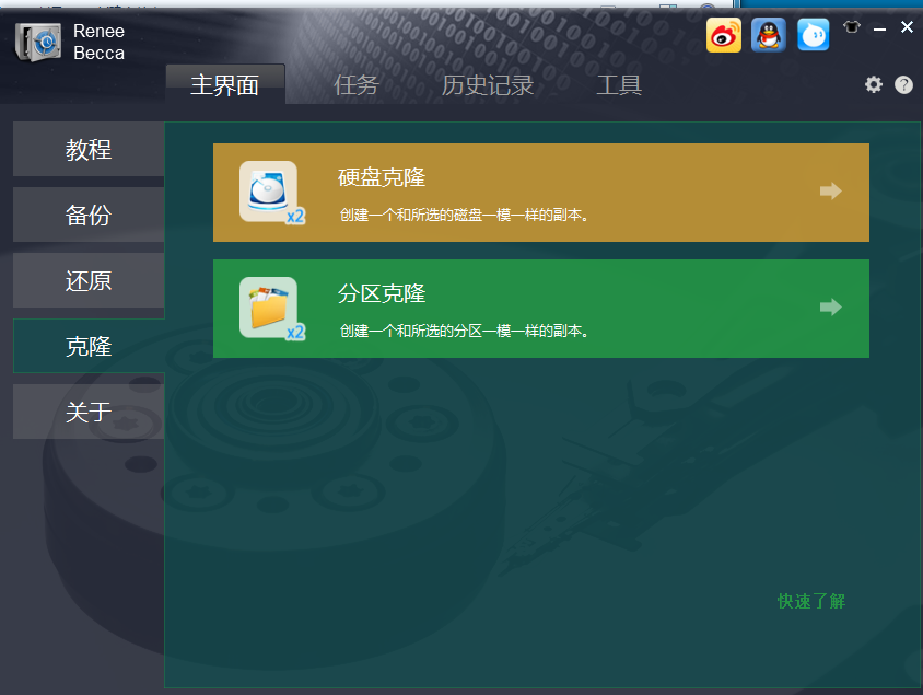 那么如何利用都叫兽™ 备份还原工具软件创建硬盘或者分区副本?首先是按要求安装备份还原软件,然后运行安装,进入主界面,选择“克隆”选项。如图所示: