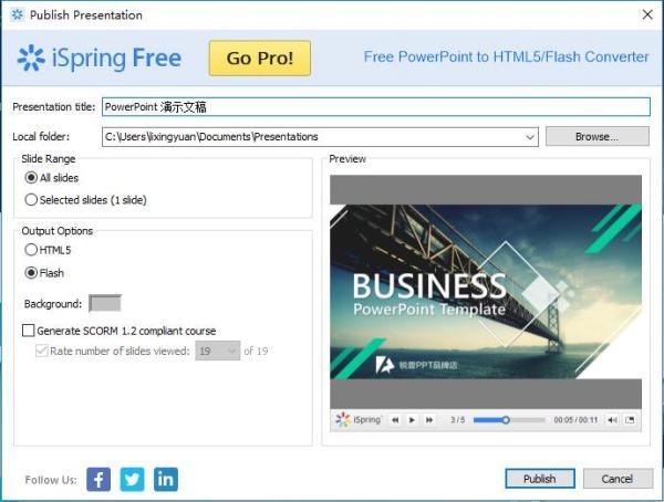 Flash/SWF格式的最大特点是体积小巧、易于分发,兼容所有的操作系统和,而iSpring Free带来的这一切是免费的,虽然收费的iSpring Presenter能自定义更多选项,免费版也已经足够用了,已完全兼容Office 2010。iSpring Free 是以 PowerPoint 插件的形式工作的,下载后先运行。