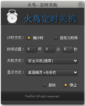 火鸟,一款功能全面的电脑定时开关机软件。软件功能全面,使用简单,而且能设置几分几秒来定时开关机,非常好用,赶紧下载试试!
