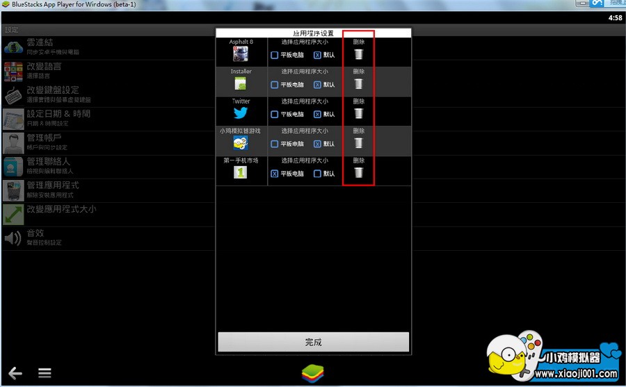 说完安装后就要提到卸载了,大致上与一般的安卓手机的操作相同,首先点击主界面中的“设定”按钮,在打开的窗口中选择“管理应用程序”,然后在要卸载的应用程序的右侧点击“删除”按钮以卸载相应的程序,点击确定即可卸载不需要的程序。