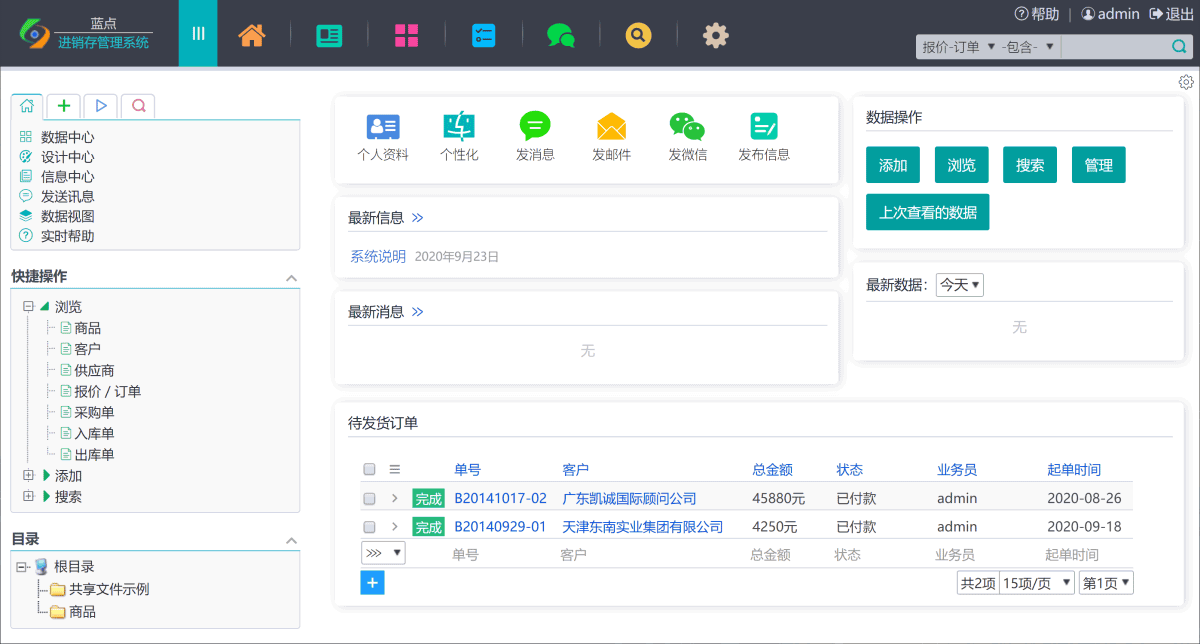 该系统基于蓝点通用管理系统,预置了商品、客户、报价/订单、采购、出入库等功能模块,是一个灵活易用的、具有无限扩展能力的在线管理系统。通过自己设计模板和流程,可实现任意的数据信息管理和工作流管理。关于如何设计模板,请看帮助中的《三分钟入门》。