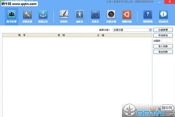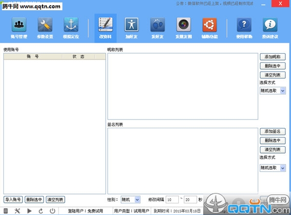e时代,支持微信、QQ、手机各种帐号循环登录使用,并可批量导入帐号,能随意添加、修改用户资料;可批量添加好友,并支持使用手机号快速添加;支持多条消息随机发送、定时发送朋友圈动态,并对好友的动态、文章批量赞和批量评论等。