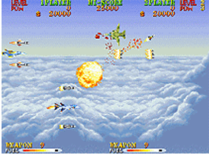 很早以前的横版飞机游戏,每关消灭敌关BOSS后都会有奖励金钱,这些钱可以用来在下面一关购买不同的导弹,不同的导弹也是用来对付不同的BOSS的,有跟踪、对地导弹等,当然最重要的还是可以用来买加长生命的血槽,还有一种就是保护圈了, 游戏中的飞机一般捡的都是绿色的子弹,其它两种子弹好像没什么用...