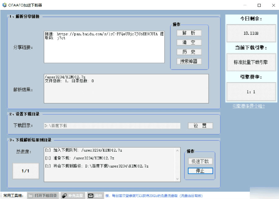 OFAAFO百度加速下载器是一款关于百度网盘的下载工具,该软件无需登陆百度网盘账号只需要链接即可下载文件,每天有20G的下载量,对于大部分网友来说都是非常足够的,有需要的朋友不要错过了,欢迎下载使用!