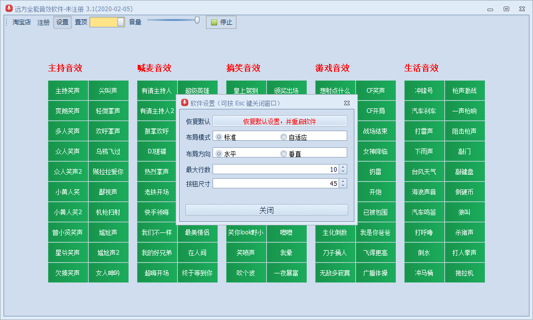 支持自定义设置音效文件、快捷键、按钮大小,按钮背景、自由拖动改变布局等