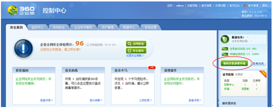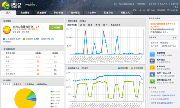 此外,360企业版提供了全网统一体检统一打补丁,能第一时间修复操作系统、流行软件漏洞及开机加速、分发软件、发送公告、流量监控、资产管理等实用功能,在很大程度上减少了企业网管的工作量,提高了整体网络的抗风险能力,因此在此前开的“2013中国国际软件博览会”上,360企业版击败众多同类产品而获得大会金奖,其企业客户数量也已突破50万大关,部署终端电脑数量达数千万台电脑。